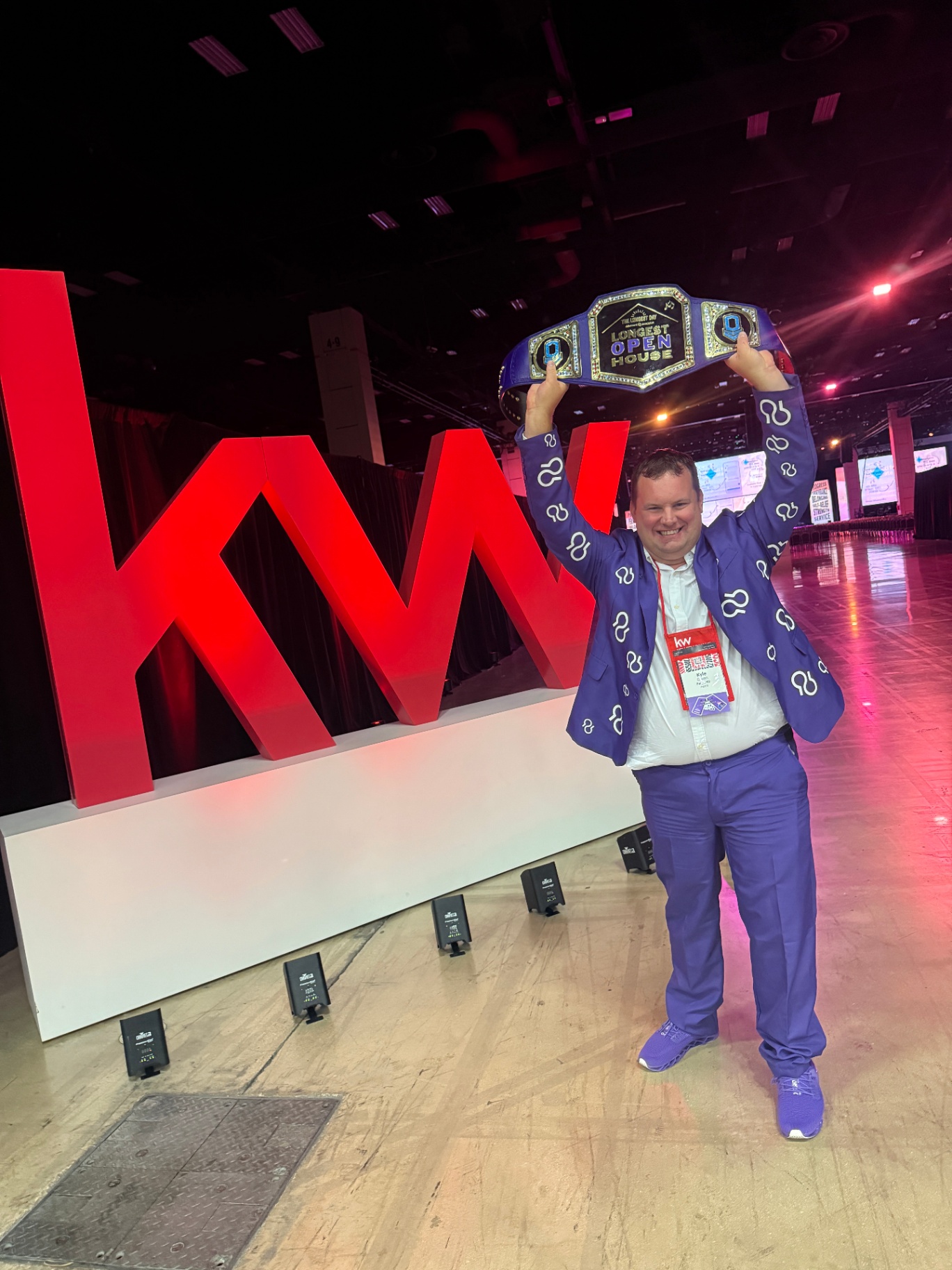 featuredImageDescription: A real photo of Kyle Olson in his purple suit holding the official “In Your Open House” championship belt in front of the KW sign—capturing the championship moment at the convention and the purpose-driven win behind The Longest Open House mission.